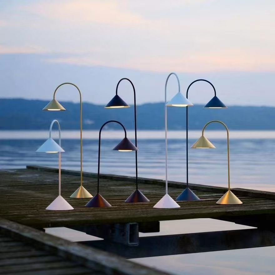 These are stylish outdoor lamps. They feature a sleek, curved arm that elegantly supports a conical lampshade. The lamps come in a variety of colors, including white, gold, black, and dark hues, which not only add a touch of modern aesthetic but also offer options to match different outdoor decor styles. Their design makes them suitable for illuminating outdoor spaces like gardens, or patios, providing both functionality and a decorative element to enhance the ambiance of the area.